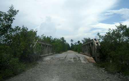 road across scary, rusted bridges only to find a mosquito-infested beach