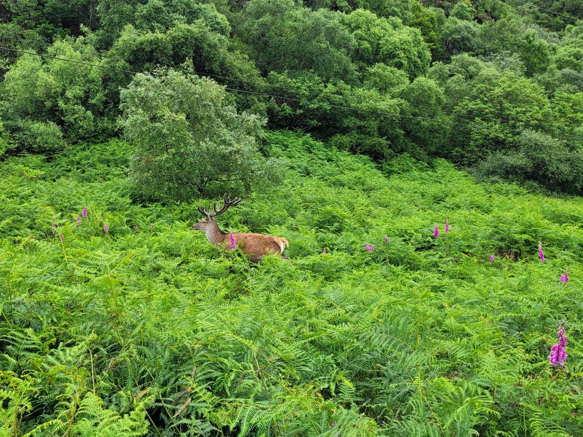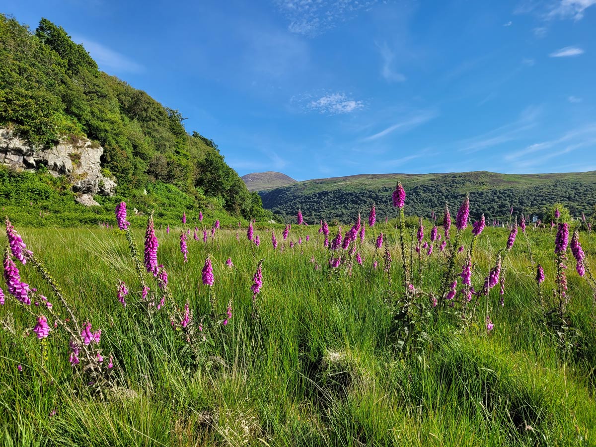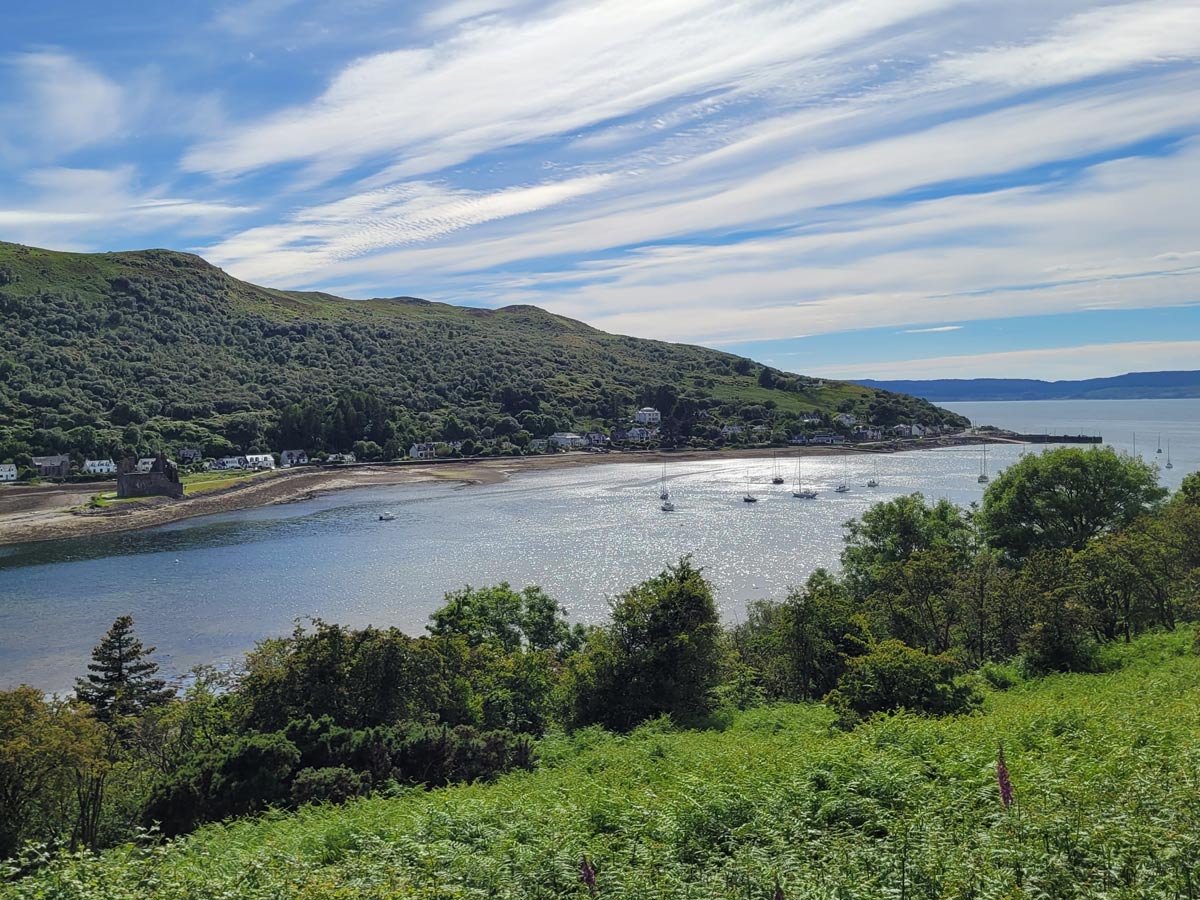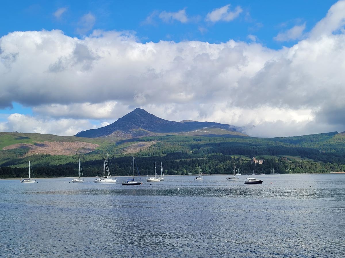 We took a ferry from Ardrossan across the firth of Clyde, arriving on Arran in the port town of Brodick. The highest point of Arran, Goat Fell, stood above, tempting us with a climb to its dramatic views. However, we had other plans. We picked up e-bikes, reserved in advance by our lovely Scottish hosts, had some fuel for ourselves, and then set out.