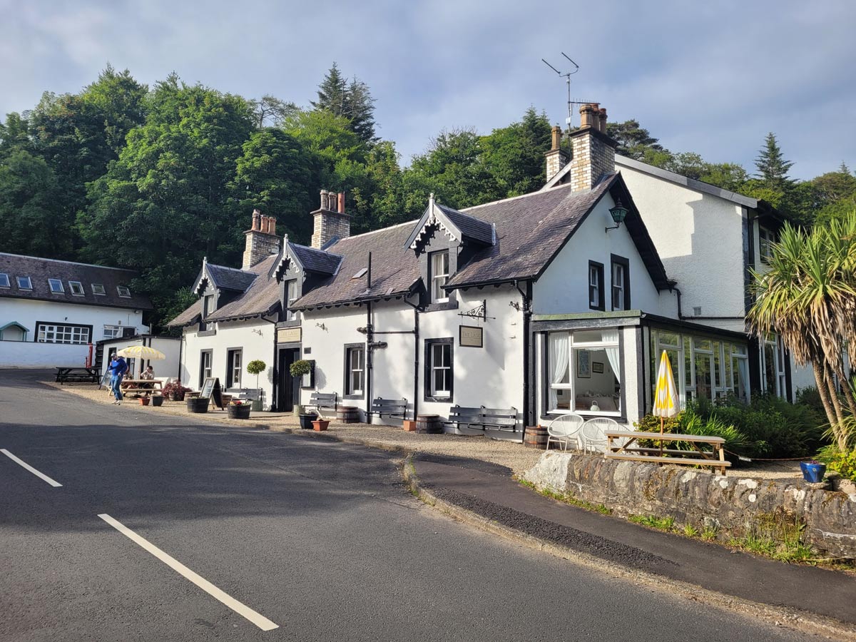 Next on my personal Must Do list, due to the aforementioned novel, was the Lagg Inn, Arran’s oldest hotel and its attached restaurant/pub. It’s a nice, whitewashed building with dark wood beams, next to a burbling stream.