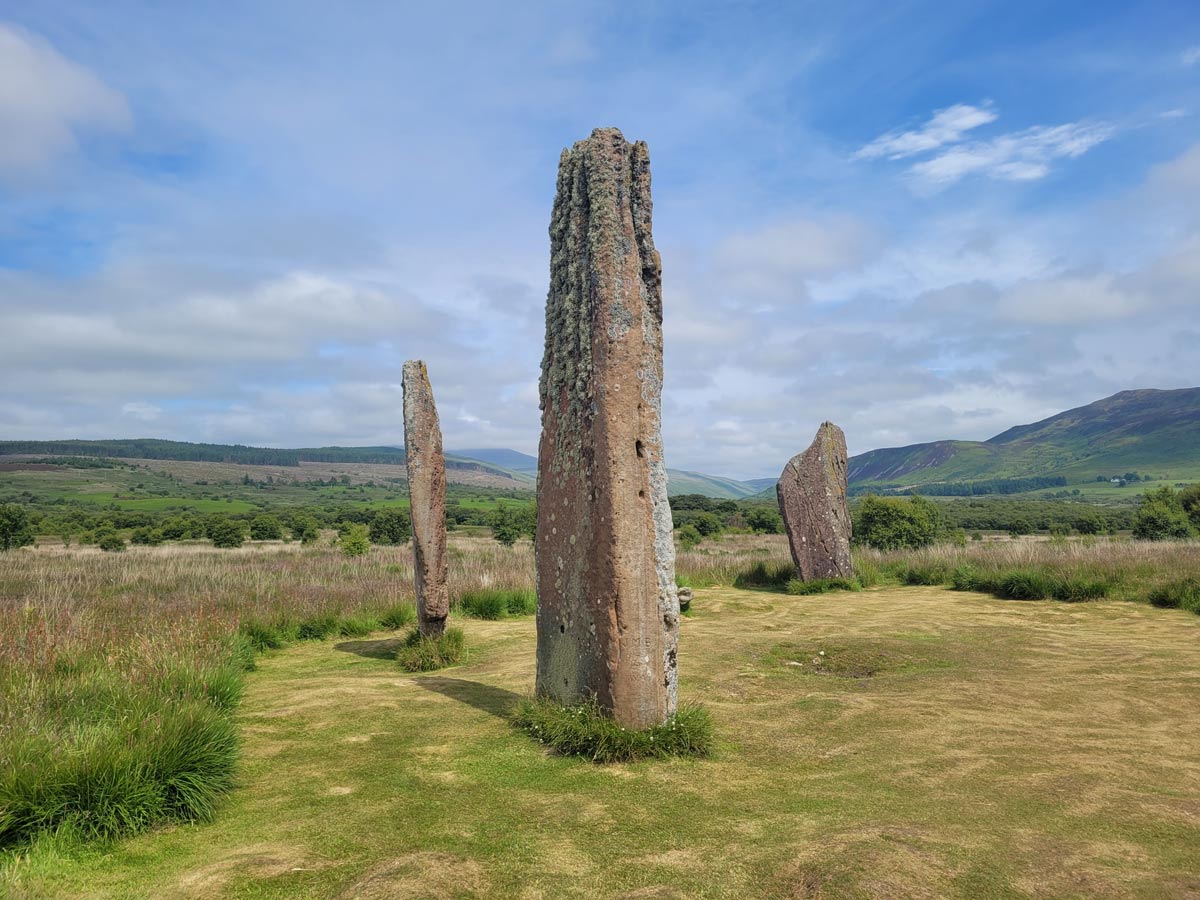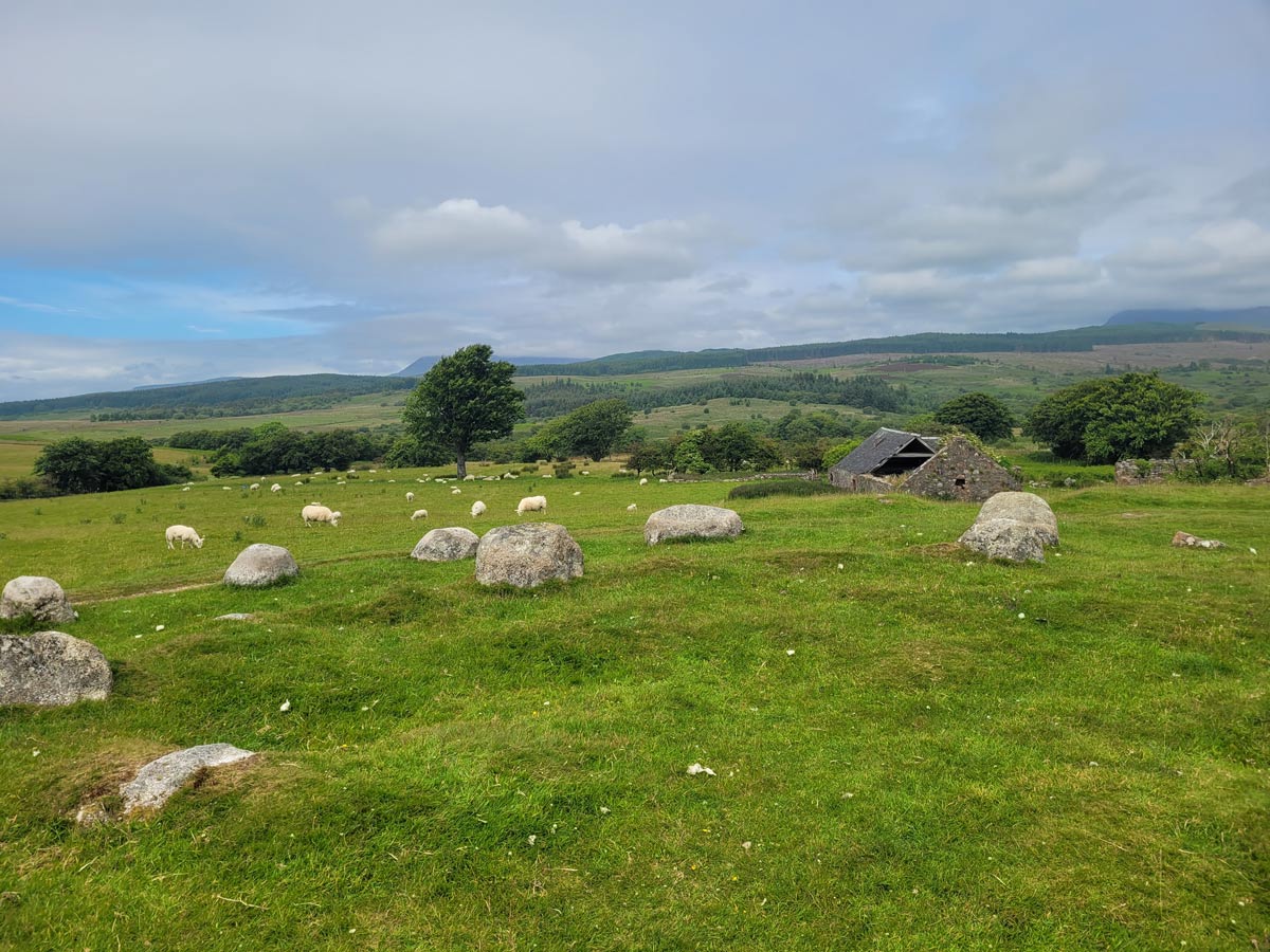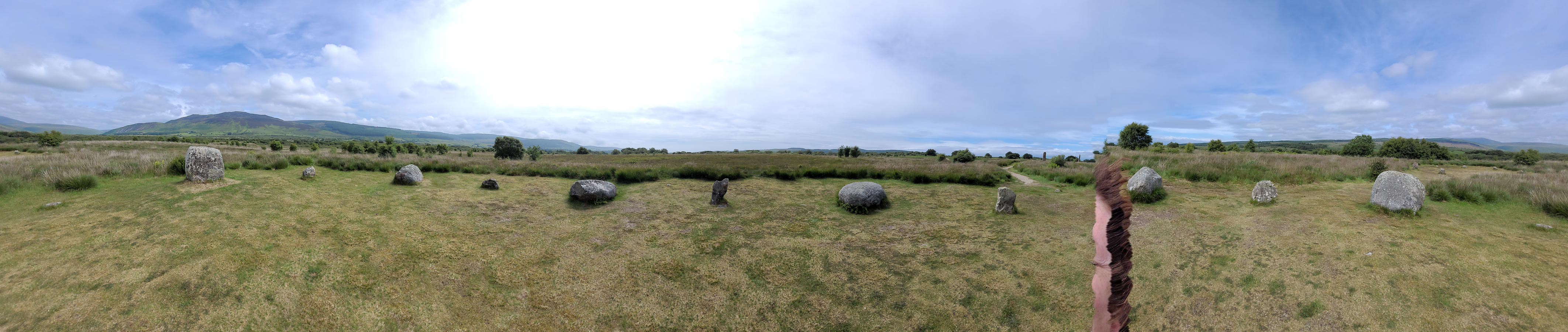 In the morning, we were back at it, stopping at the local sandwich shop for bagged lunches before buzzing on. We stopped at Machrie Moor, an area containing several standing stone sites and a burial mound (featured in a novel I’m working on.) It’s a short bike/hike off the main road to a small hill amidst a scenic valley. The various sites are bordered by ferns, sheep (it is Scotland, after all), a crumbling stone farmhouse (it is Scotland, after all), and rolling green hills (it is Scotland, after all.) Each of the sites gets more impressive until you reach several very tall, thin stones standing on end. I took a panoramic shot (click, zoom, scroll) with hilarious results. That lumpy, peach pole with hair is my significant other.